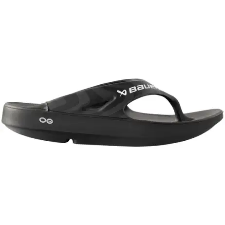 New for 2024, Bauer has teamed up with OOFOS to create a recovery hockey slide. The Bauer Hockey OOFOS Sport Flip Flops are made with proprietary OOfoam™ technology. OOFOS absorb 37% more impact than traditional foam footwear materials for the perfect blend of cushion and stability. The patented footbed cradles and supports arches. When paired with OOfoam™, it reduces energy exertion in the ankles by up to 47%* compared to competitors’ footwear. So walking is easier. Recovery is faster. And you actually feel better.